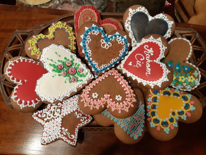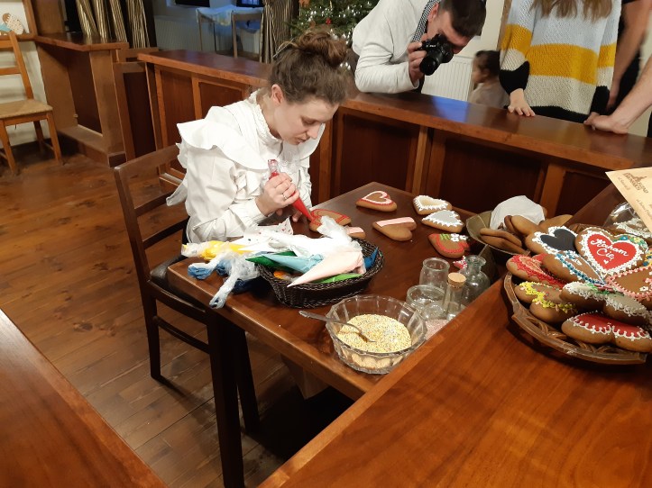 Čia po trumpo pasakojimo už papildomus 5 zł galima išmokti paišyti ant meduolio arba nusipirkti jau papuoštą.