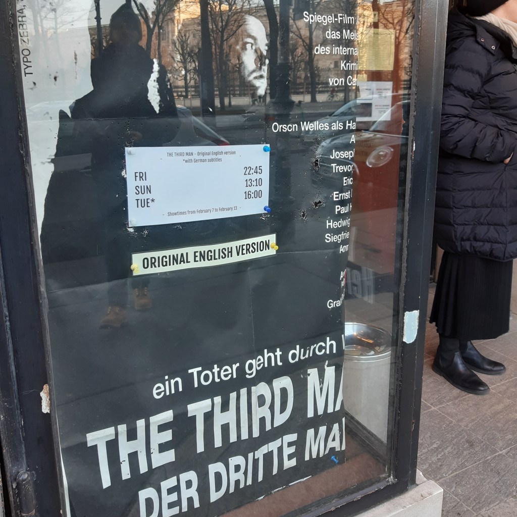 Kinas “Burg kino”, filmas “The Third Man” – antras dalykas iš serijos “gi nesuprantu vokiškai”. Ir vėlgi net neverta apie tai galvoti. Užtat verta suplanuoti savo dienos planą taip, kad papulti į vieną iš seansų (aktualias dienas bei valandas siūlau patikrinti kino svetainėje) angliško filmo “The Third Man”, kuris buvo nufilmuotas pokario Vienos, 1949 m. Pati filmo fabula yra gan paprasta (detalių neatskleisių), tačiau didžiausia to filmo vertė yra pati nufilmuota Viena. O kai dar žiūri tą filmą mieste, kur vyksta veiksmas, pradėdi jį suprasti. Išeini po seanso, apsižiūri aplink ir kažkaip savaime visos detalės, prieš tai niekaip nesueinančios į vieną bendrą paveikslą, pačios sustoja į savo vietas. Žinote tą jausmą kai šiurpuliai bėga per visą kūną? Tai va.