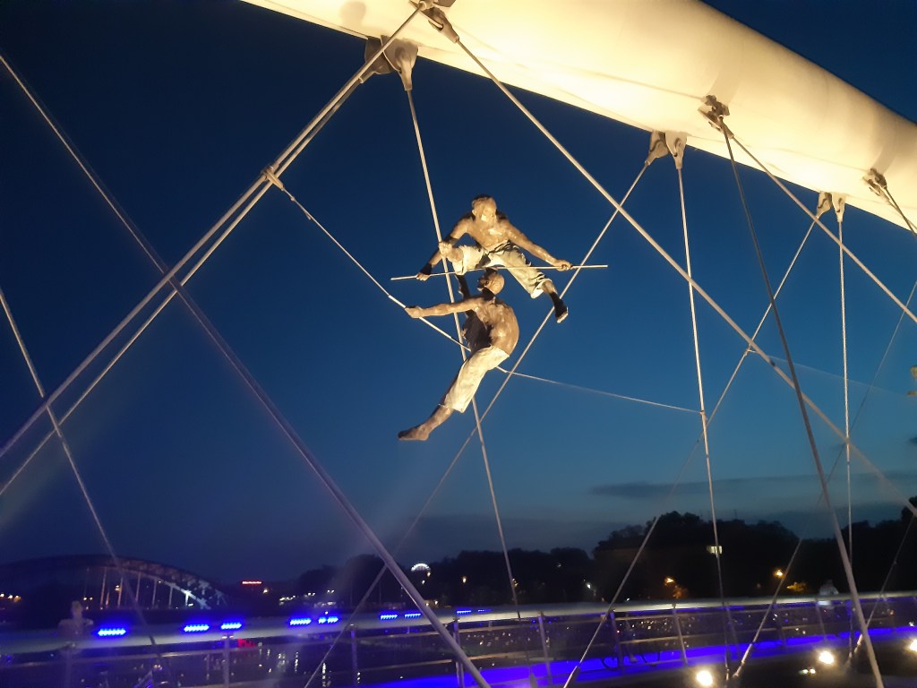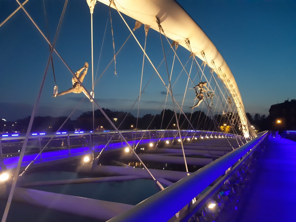 Tiltas, kuris iš tikrųjų susideda iš dviejų vienodų tarpusavyje sujungtų dalių, sveria net 700 tonų. Gražiai apšvestas, skirtas tik pėstiesiems ir dviratininkams nors ir tebėra Krokuvoje vos dešimtmetį, jau tapo viena iš turistinių vietų. Papildomo žavėsio jam priduoda kabančios sportininkų figūros. 10 skulptūrų, kurių autorius yra Jerzy Kędzior, pakibo ant tilto 2016 m. kaip laikinoji paroda. Miesto gyventojai ir svečiai taip buvo sužavėti bendra kompozicija, kad paroda buvo pratęsta net iki šių metų spalio mėn. Deja, miestas galėjo sau leisti nupirkti tik keturias figūras, o likusios grįžo autoriui. Labai tikiuosi, kad tai dar nėra istorijos pabaiga ir dar bus “happy end’as”. Prie tilto nueiti vistiek verta.